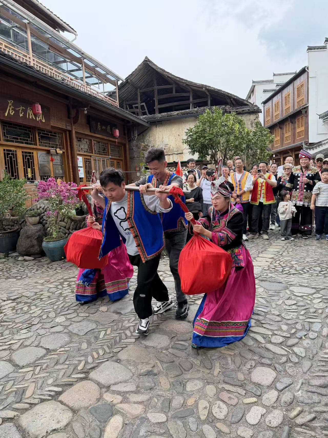 畲族村寨的婚嫁体验为团建增添了别样的乐趣,今天,我们更是一家人,“重要人员”身着绣有精美纹样的畲族传统服饰,沉浸式参与畲族婚嫁仪式——拦门酒、对山歌、迎亲等环节,趣味盎然,在欢声笑语中体验“畲乡婚俗”的独特魅力。