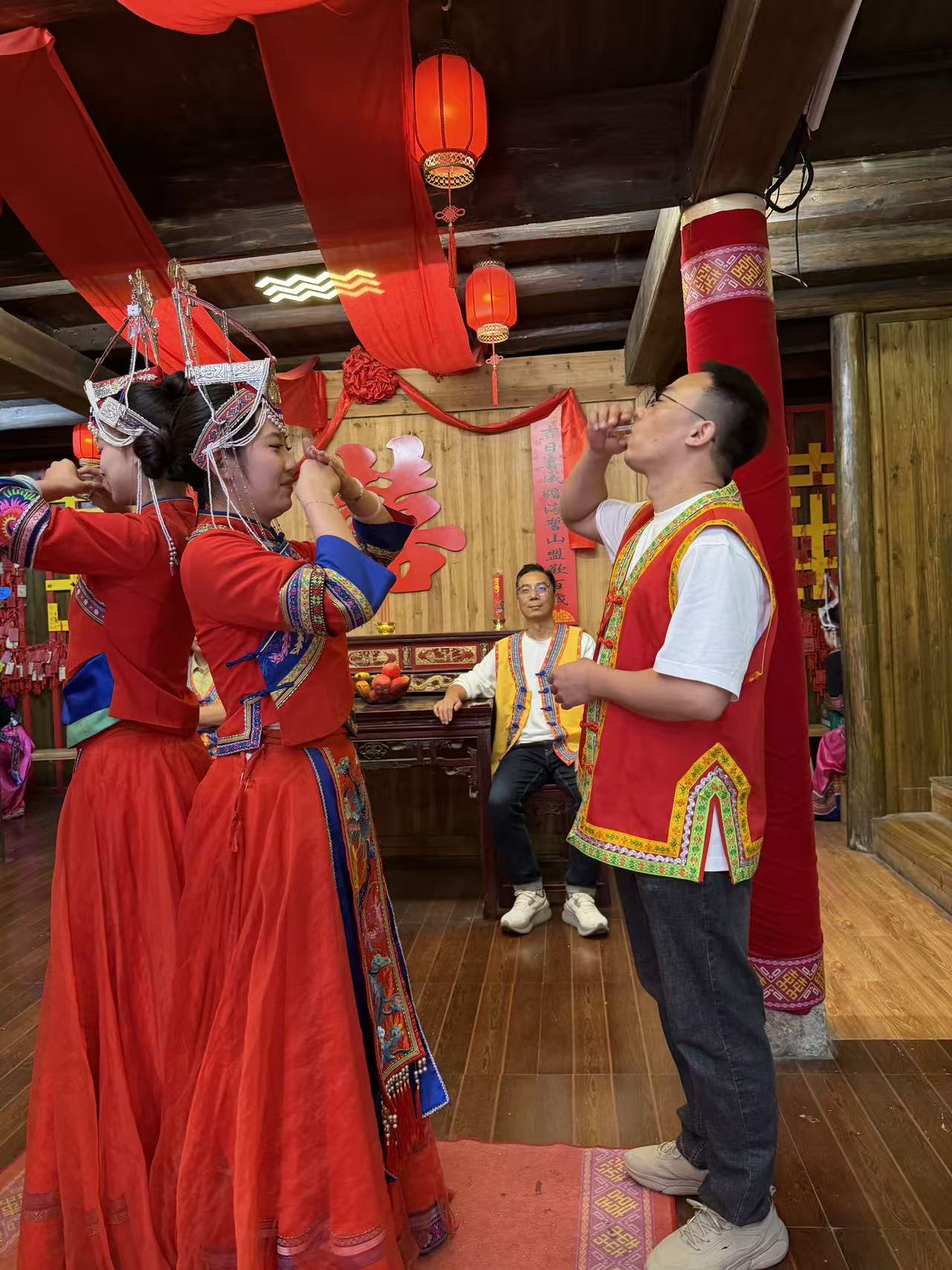 畲族村寨的婚嫁体验为团建增添了别样的乐趣,今天,我们更是一家人,“重要人员”身着绣有精美纹样的畲族传统服饰,沉浸式参与畲族婚嫁仪式——拦门酒、对山歌、迎亲等环节,趣味盎然,在欢声笑语中体验“畲乡婚俗”的独特魅力。